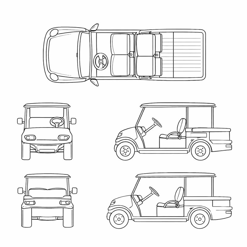 - Sedan, SUV, van, pickup, hatchback, coupe, convertible, passenger van, box truck, golf cart, motorcycle, bicycle, and tractor/other layouts.